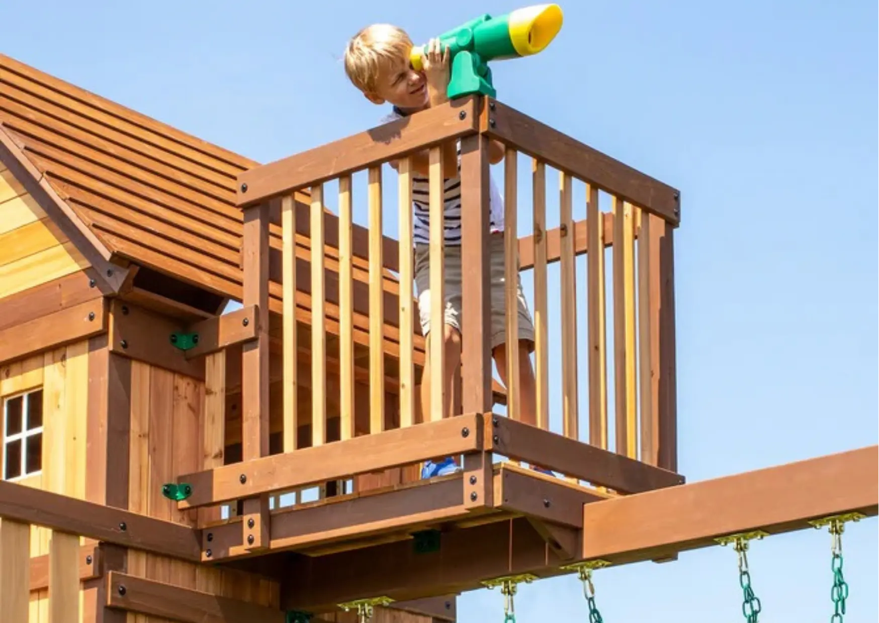 Clubhouse elevado con techo de madera, balcón, entrada cubierta y ventanas tipo bahía para juego al aire libre.