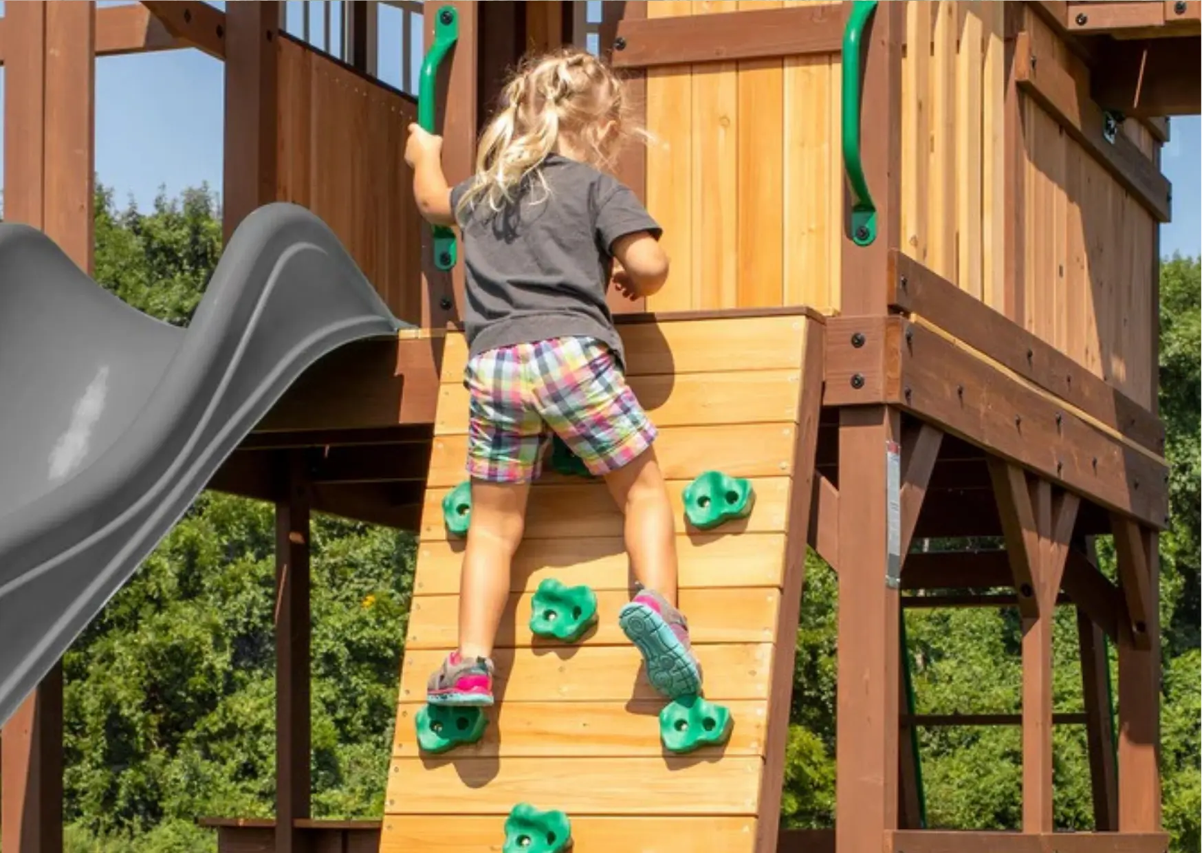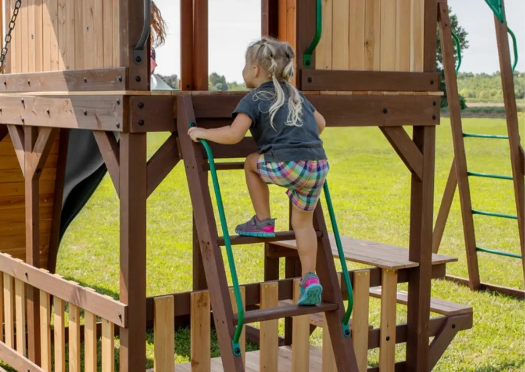 Escalera de peldaños anchos para fácil acceso a la estructura para niños de diversas edades.
