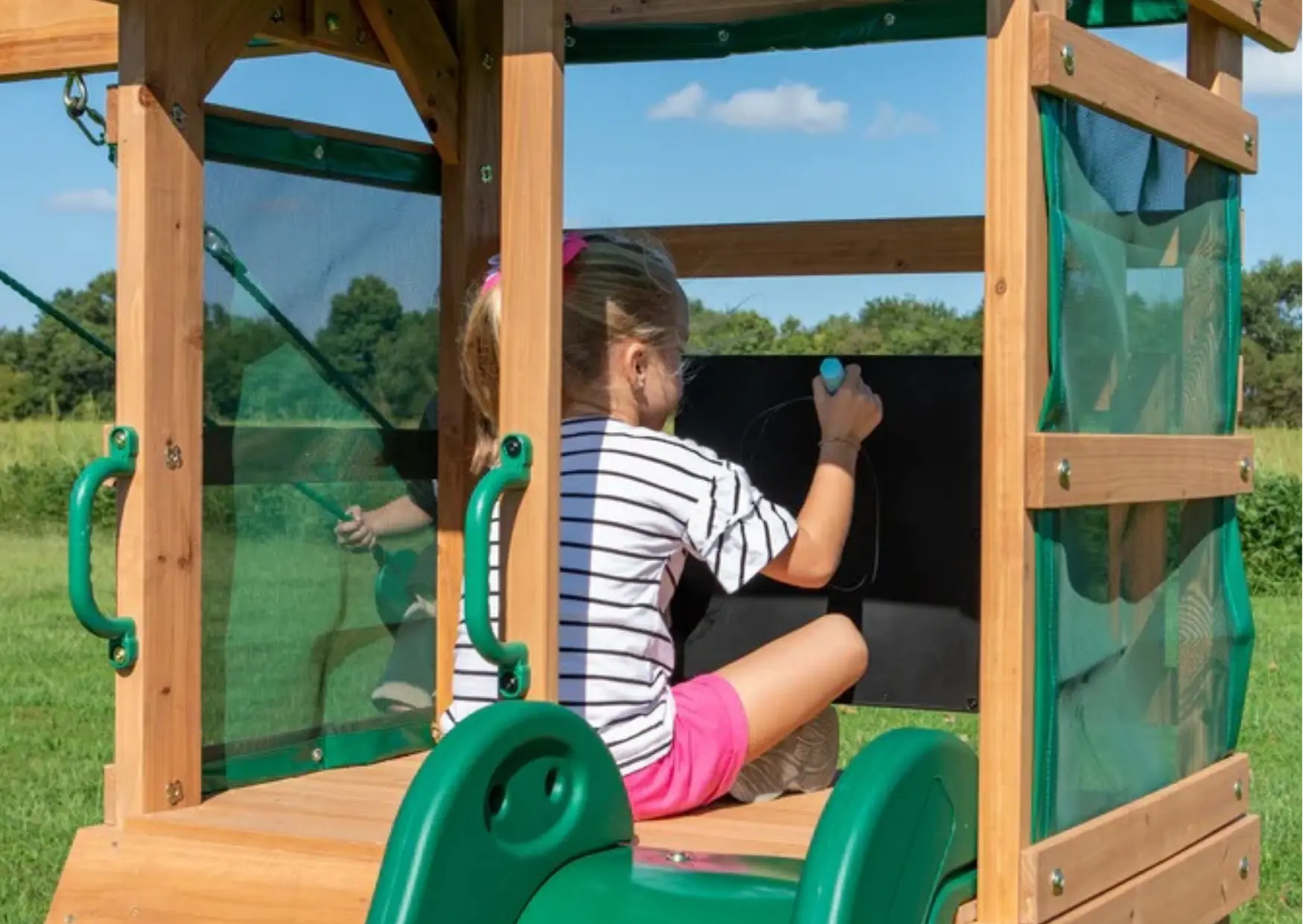 El Crestwood Swing Set 2 incluye columpios seguros de cuerda, resbaladero de 6 pies y pizarra para creatividad al aire libre. Ideal para patio familiar.
